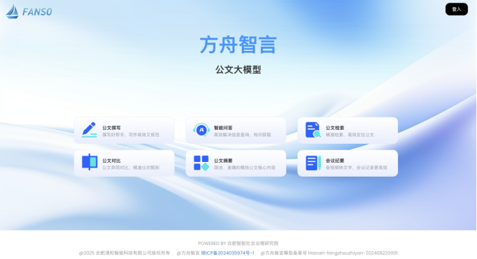研究院联合相关机构开发的“方舟智言公文大模型”作为智能化公文处理平台,具备公文撰写、智能问答、公文检索、公文对比、公文摘要、会议纪要生成、知识库管理等功能,目前已开放公测(方舟智言公文大模型官方网址:https://policy.fanso.net)。方舟智言大模型依托清华大学政府文献中心180万份权威政策数据进行训练,融合自然语言处理与机器学习技术,实现公文内容逻辑严谨、格式规范的全流程保障,是政务数字化转型中的高效写作助手。